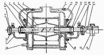 1.泵體 2.后蓋 3.前蓋 4.泵軸 5.平鍵 6.葉輪 7.軸承瓦架 8.滾珠軸承 9.園螺母 10.進(jìn)水管 11.水封管 12.泵聯(lián)軸器 13.電機(jī)聯(lián)軸器 14.軸承蓋 15.鍵 17.軸套螺母 18.軸套 19.填料涵 20.毛氈圈 21填料函壓蓋