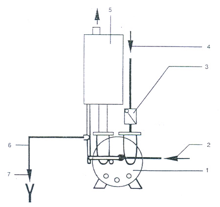 1. 2BV 真空泵 2. 供水管 3. 逆止閥 4. 吸氣管 5. 氣水分離器 6. 排氣管 7. 溢水管 |