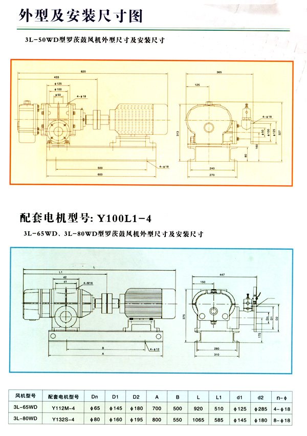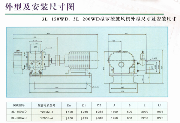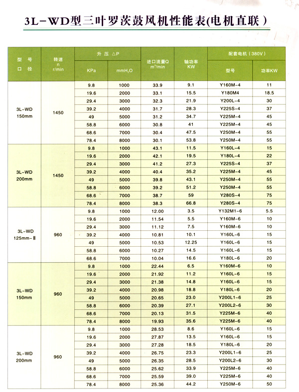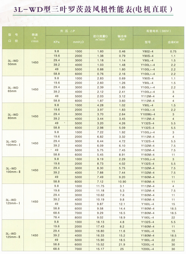 一、3L-WD型三葉羅茨鼓風(fēng)機(jī)性能表: